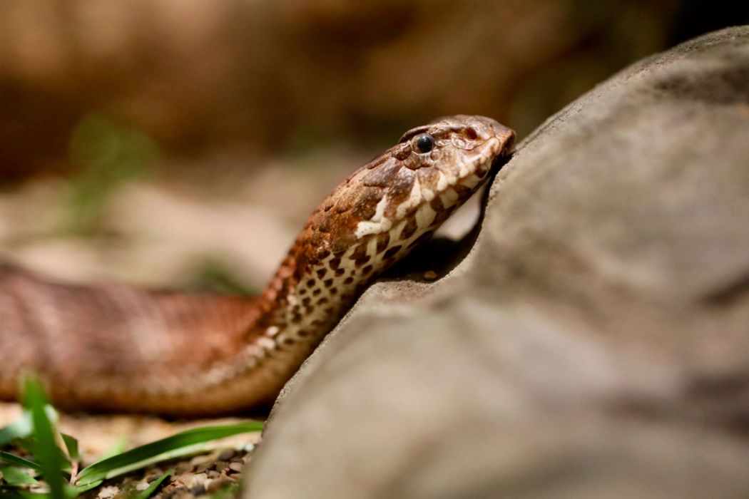 The death adder is one of Australia’s most distinctive and dangerous snakes. Unlike most snakes, it has a short, stocky body with a broad, triangular head and a very short tail. Adults typically measure 60cm – 1m in length. Its colouration varies depending on the region, but it usually has bands of reddish-brown, grey, or black across its body, helping it blend seamlessly into leaf litter and soil. Death adders are ambush predators, lying motionless and using the tip of their tail as a lure to attract prey. They strike with incredible speed, delivering a potent venom.