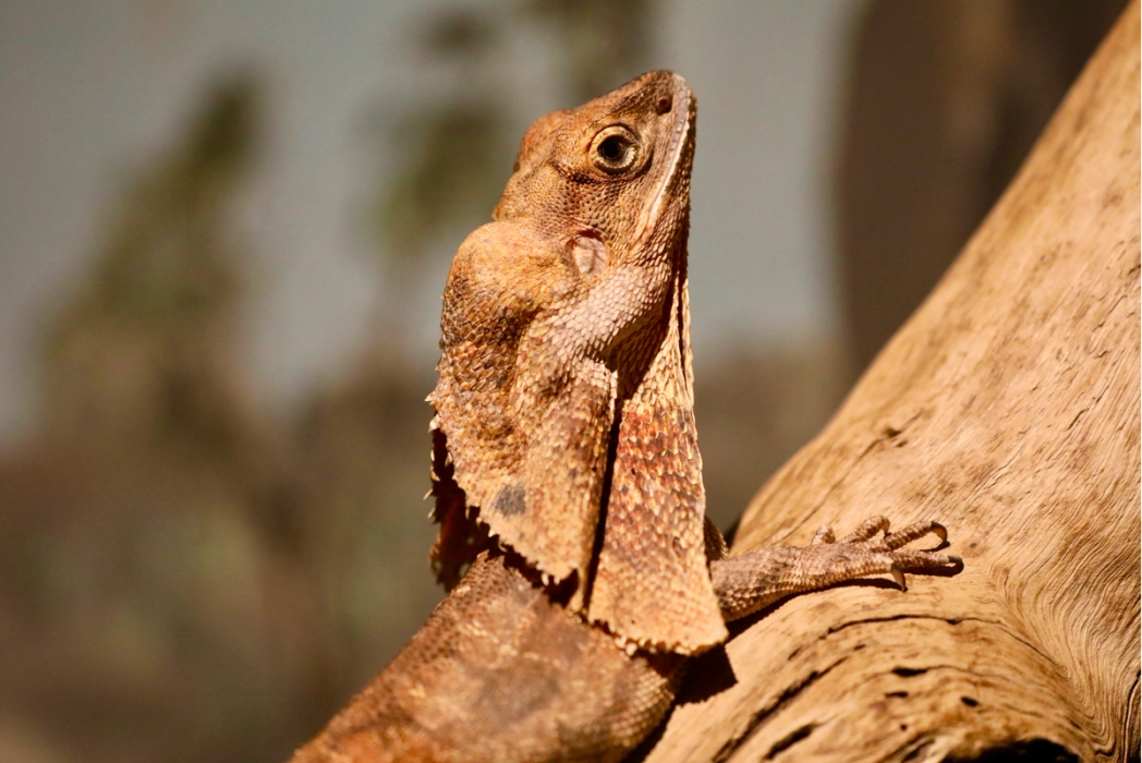 The frilled lizard (commonly known as the frill-necked lizard) grows to around 45-90cm in length, about two-thirds of which is tail. It has a vivid yellow mouth and a large extendible frill gathered about the neck and under throat. The combination of the gaping mouth and the wide, brightly coloured frill provide an intimidating sight to any potential predator. It frequently runs at speed on two legs to escape danger, quickly climbing the nearest tree to safety. Their colour can be brown or grey with the frill being lighter and often tinged with orange or reddish-brown. Males are bigger than females and have a more robust appearance. There are two long, pointed canine-like teeth present in the lower jaw, which can inflict a painful bite.