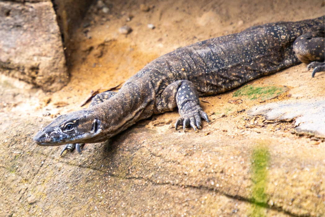 Also known as Rosenberg’s monitor, the species is known to be a large and fast predator with rugged bodies and long tails, reaching 1.5m in length. It is dark grey above, finely spotted with yellow or white, and with paired, blackish cross-bands from the neck to the end of the tail. The pairs of narrow, regular bands around the entire length of the tail is a distinguishing feature, separating it from the more common lace monitor, which has very wide, light and dark bands towards the tip of the tail.