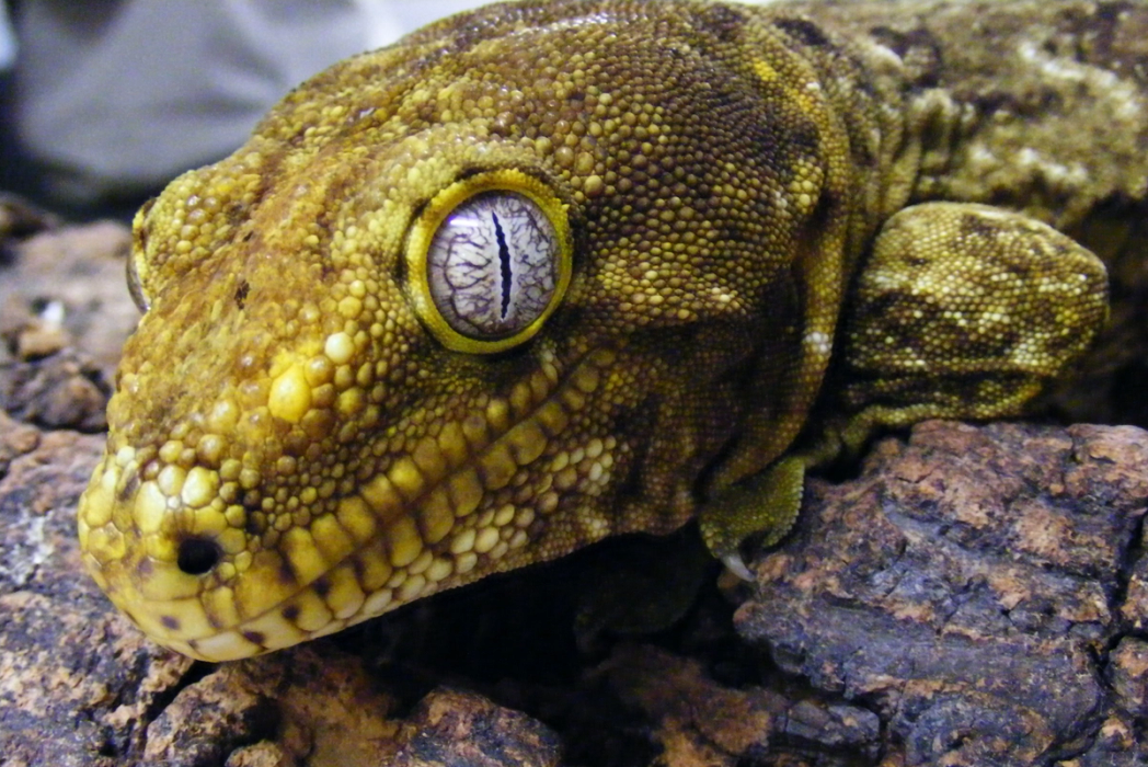 The New Caledonian giant gecko is the world’s largest gecko, growing up to 36 centimetres long. This stout gecko has a short blunt tail and its skin, which has many loose folds, seems too big for its body. Unlike most geckos, it has claws on its toes, and these, along with a grasping pad under the tail, help it cling on to tree trunks. Here they are perfectly camouflaged – their mottled light and dark grey, olive-green and pale brown colouration merges perfectly with the underlying bark.