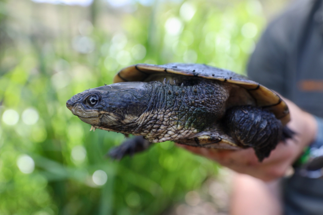 The saw-shelled turtle is carnivorous and feeds on fish, tadpoles, frogs, and aquatic insects, and is one of the few native Australian animals successful in preying on the introduced cane toad. Toads too large to swallow whole are first shredded with their front claws.