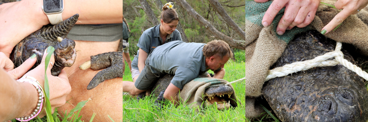 Led by Billy, the team carefully pulled Steve from the feeding ramp and onto land. Once secured, he was restrained while a full check was carried out by the reptile team.