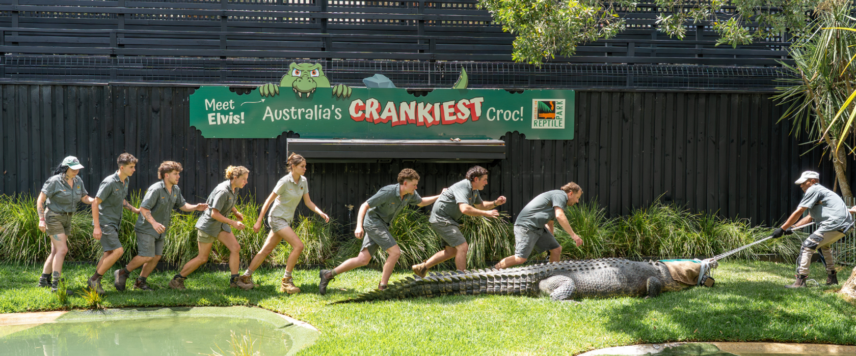 The Australian Reptile Park has once again come face-to-face with prehistoric power, successfully capturing Elvis the Crocodile who is the Reptile Park’s largest, most dangerous, and most notorious resident. Measuring an enormous almost 4.8 metres long and armed with bone-crushing jaws, Elvis is widely regarded as Australia’s crankiest crocodile, and with good reason. In his 14 years at the Reptile Park, he has only ever been captured three times due to the extreme risk involved.